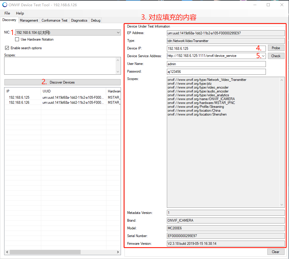 点击“probe”探测选中主机是否真的支持onvif协议,如果没有弹框报错那就是支持的。